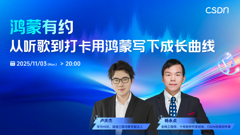 听歌涨英语,打卡不摸鱼! 当英语学习遇上习惯养成,会碰撞出怎样的火花?本期【鸿蒙有约】邀请两位优秀开发者带来他们的实战案例——一个是边听歌边涨英语的学习App,一个是助你打卡养成好习惯的效率神器。 他们将分享从0到1开发鸿蒙应用的全过程,讲透架构设计、性能优化、创新亮点,以及开发者激励计划和鸿蒙创新赛的实用经验。无论你是初学者还是资深开发者,都能在这90分钟里,收获灵感与成长动力!