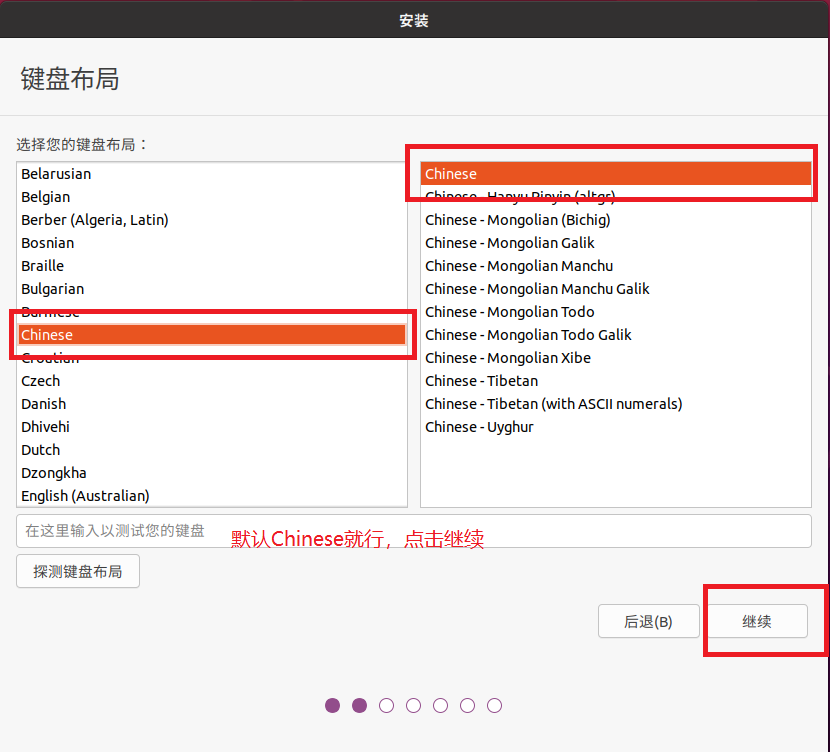 2.选择键盘布局,选择Chinese(默认就行),点击继续