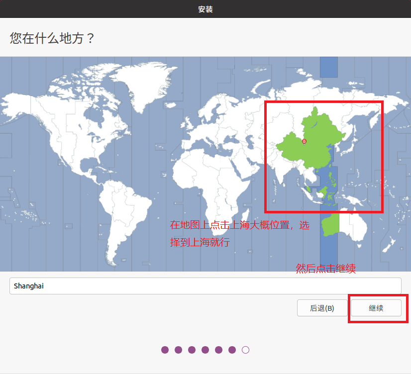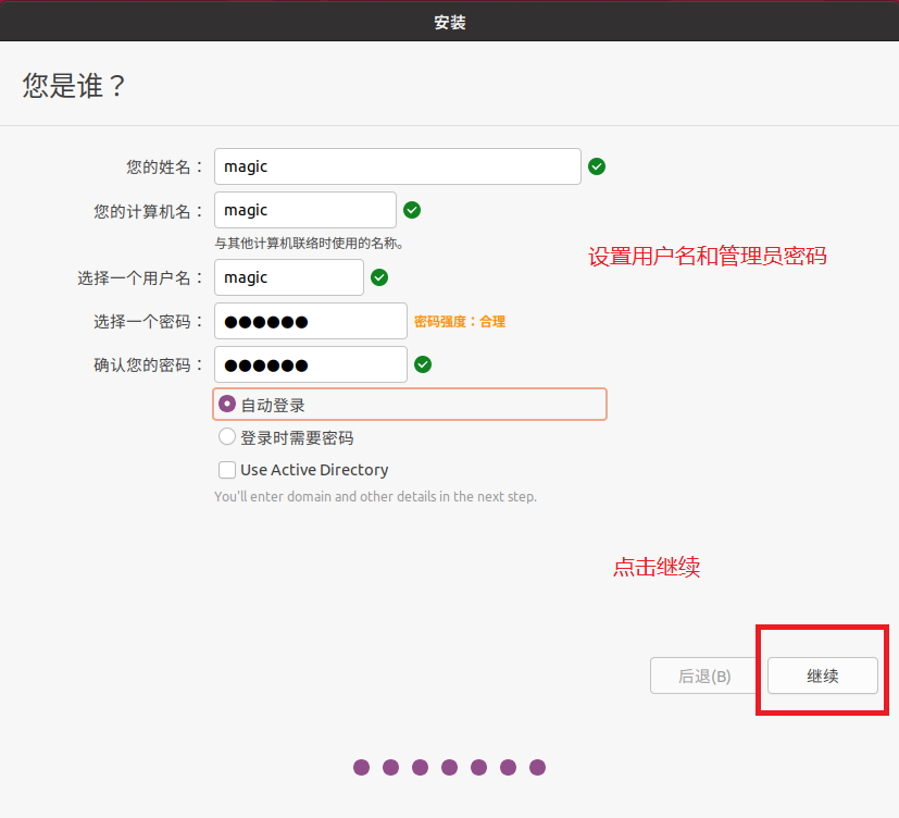 注:这边安装的时候可能看不见下方的选项,按Tab键,当选择方框看不见的时候为第一次,之后再按两次Tab键即可选择到继续按钮,回车即可(如果你用的是VMware的话可以安装vmware tools全屏就好)
