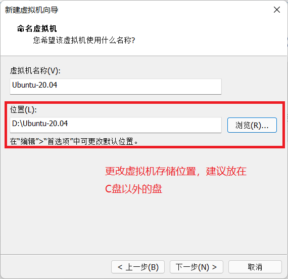 4.命名虚拟机,并选择存储位置(建议存放在C盘以外的磁盘中),然后点击下一步