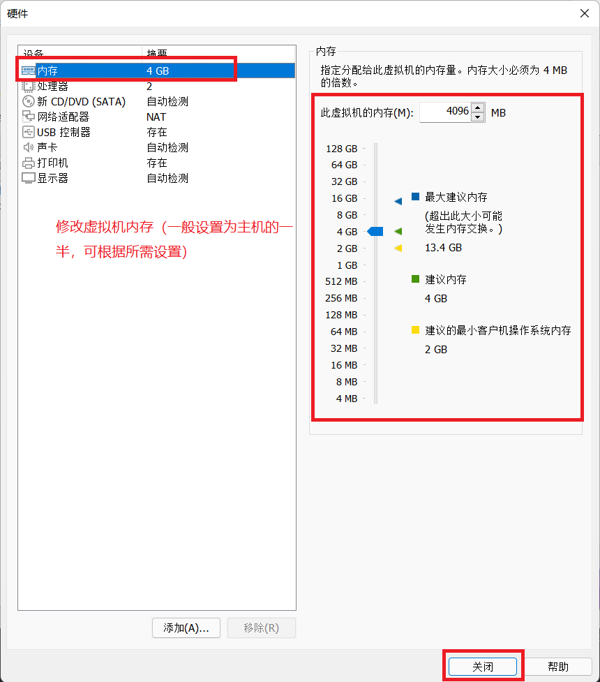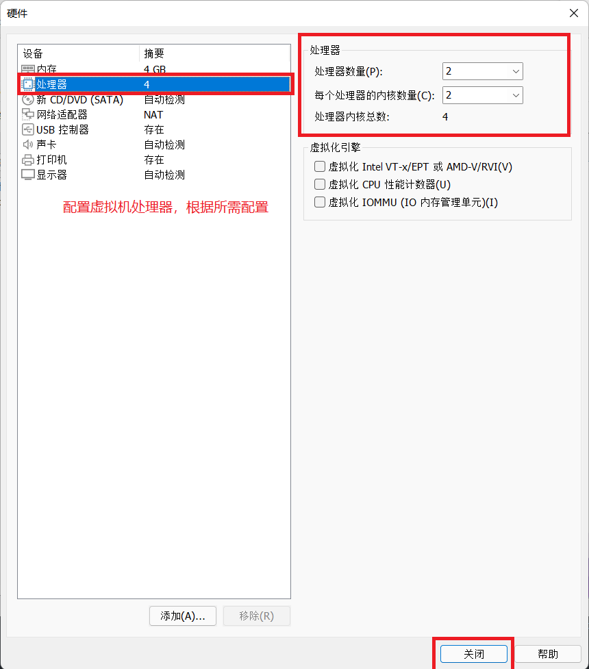 7.修改虚拟机内存,一般根据主机内存来设置,为主机内存的一半为最好(我电脑内存为16G,这里只选择了4G),然后点击处理器
