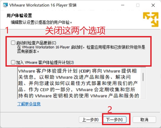 5.关闭启动时检查更新和加入体验计划,然后下一步