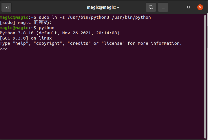 2.软连接Python3,输入: sudo ln -s /usr/bin/python3 /usr/bin/python 回车即可 输入python 将会显示python3.8