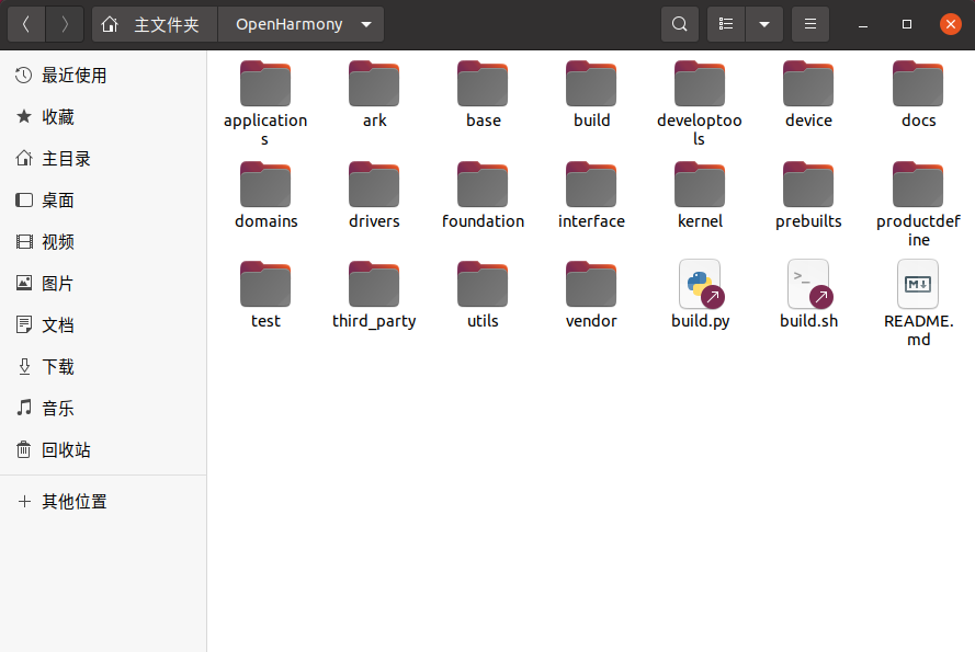 等待一段时间后,可见产生一个code-v3.0-LTS文件夹,里边包含着OpenHarmony文件和一个Readme文件,这个时候我们可以把这个OpenHarmony放到想要的工程目录下(笔者这里给移动到了主目录下边,方便开发使用)