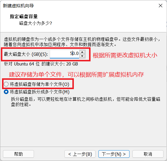 5.选择虚拟机最大磁盘大小(根据所需设置),建议存放在一个文件里,便于磁盘扩展,然后点击下一步