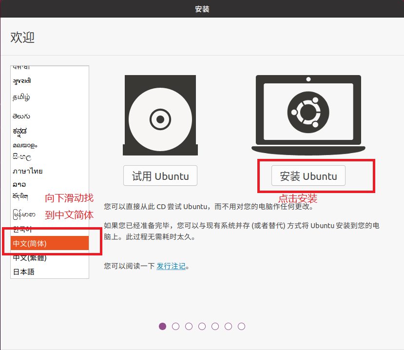 1.在左边滑动找到下边的中文简体,然后点击右边的:安装Ubuntu