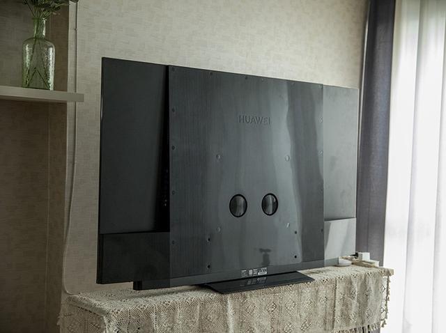 外观上华为智慧屏V65也没有太多的差异,和其它传统电视最大的不同在于机身顶部有一颗可升降的摄像头,这是为华为智慧屏的视频通话功能所准备的。机身因为是侧入的设计,所以背板部分还是挺薄的。