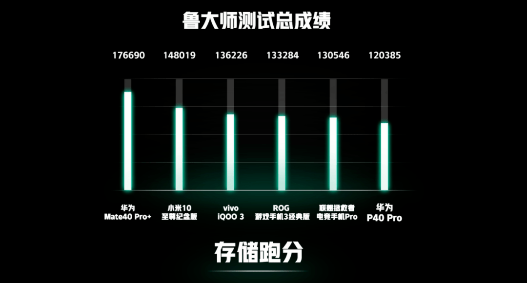鲁大师性能总分方面,华为Mate40 Pro+来到了90W+的新高度,完胜其他选手。安卓阵营中目前最强的小米10至尊版也才85万,低了5万分。