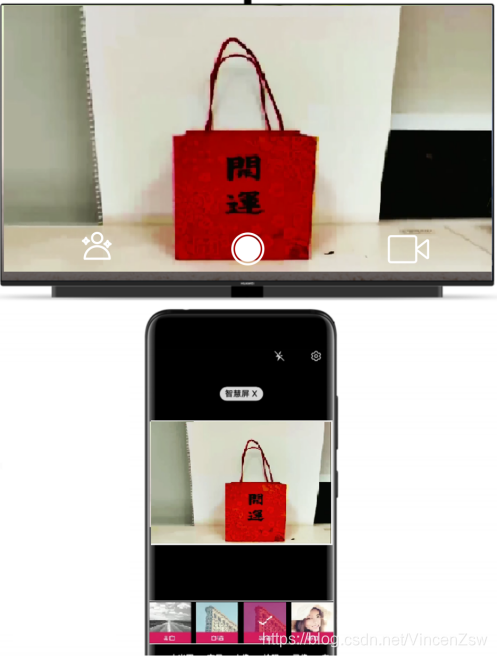 在这里我们就“智能家居美颜相机”进行简单介绍。大家是否想过家里的大屏也能像手机一样进行美颜拍照,但是大屏不具备美颜计算的能力怎么办?没关系,你的手机能够美颜就可以。在这个场景中,可以让基于鸿蒙系统的大屏调起手机的美颜能力,完成大屏美颜拍照。该项目包含了鸿蒙系统的视频编解码、通信协议、视频渲染等模块(先放上个图给大家看下效果)。
