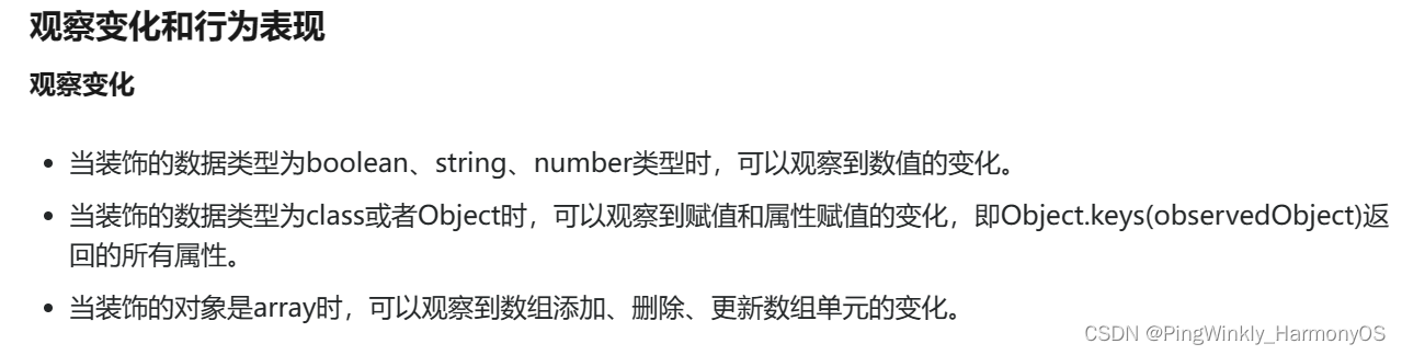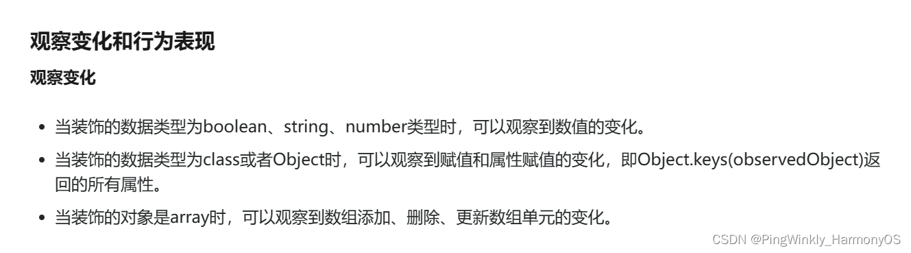Object、class、string、number、boolean、enum类型,以及这些类型的数组。类型必须被指定,且必须和LocalStorage中对应属性相同。不支持any,不允许使用undefined和null。