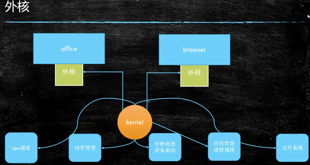 基于内核,延伸出“服务定制化”的外核。如浏览器browser运行在操作系统中,基于操作系统内核,专门给browser量身定制一个外核,专门给browser用,以达到更棒的应用使用效果。