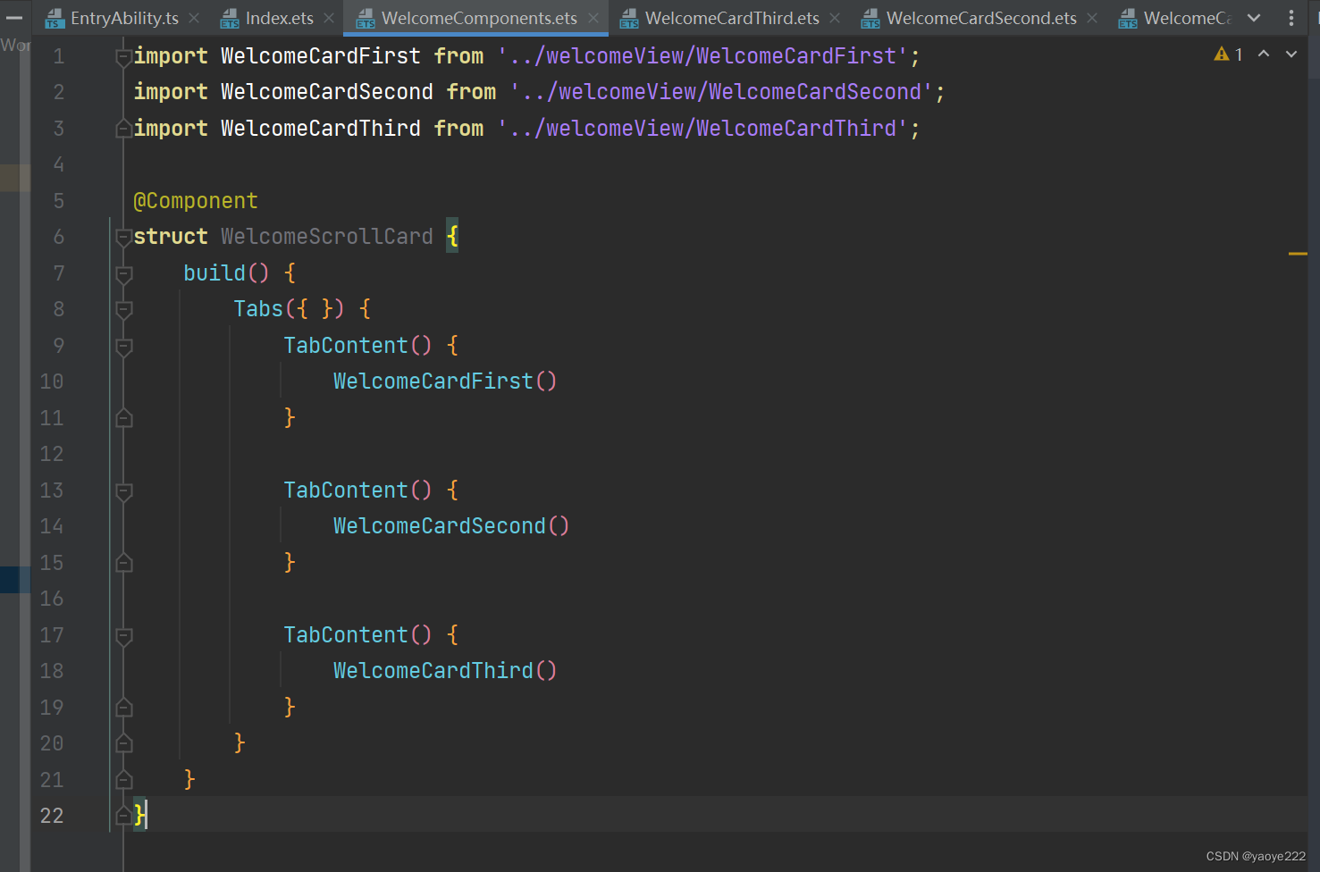 为了能够实时预览页面制作的效果,可以先将WelcomeScrollCard组件默认导出后加载到Index.ets中