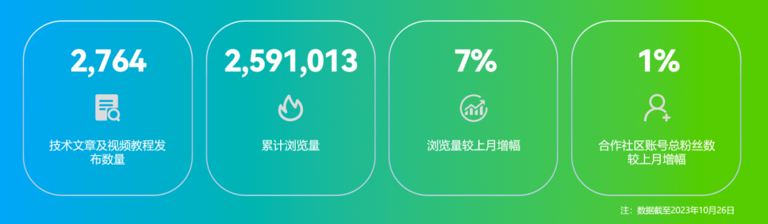 截至 2023 年 10 月 26 日,9 个合作社区共发布内容(含技术文章、视频教程)2,764 篇,累计获得总 PV/UV 数 2,591,013,同比上月增长 7%,账号获得粉丝数 2,152 人,较上月增幅 1%。