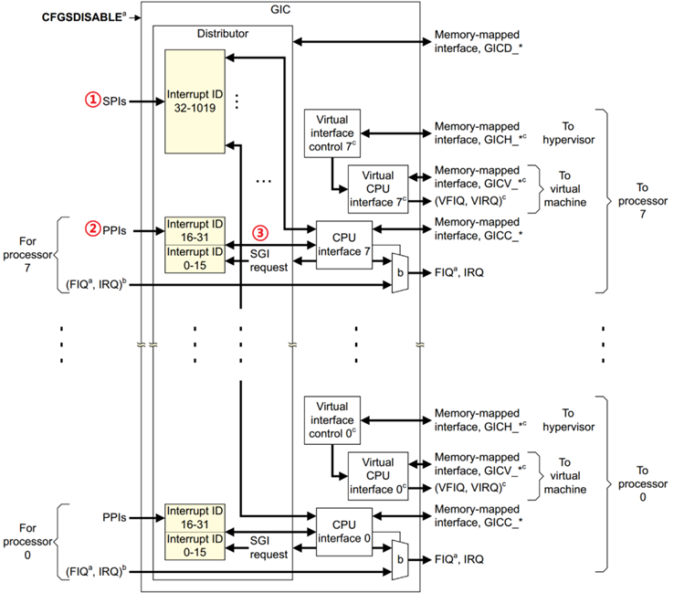 在图中,SGI是软件(软件运行在CPU上)触发,所以SGI中断源头是各个CPU上的应用,另外SGI和PPI一样,每个CPU都有属于自己的SGI,所以必须指定CPU。