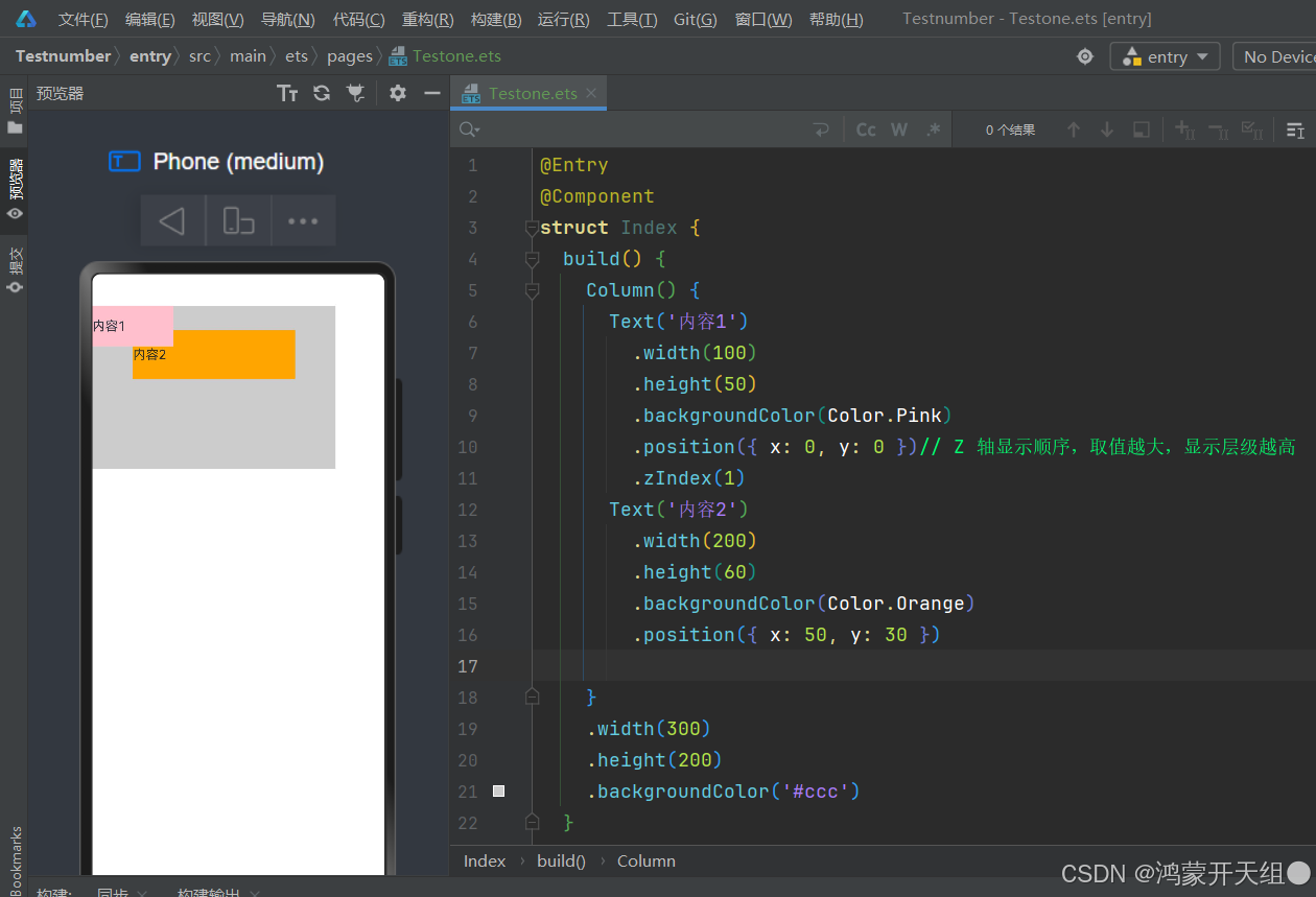 定位后的组件,默认后定义的组件在最上面显示,可以通过 zIndex 属性调整显示层级
