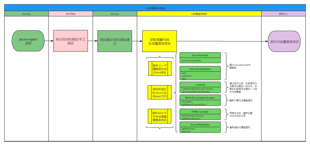 - 解析新生成的 exec 文件,通过改造后的 Report 服务根据方法名,设置方法对应的行号,重新渲染行覆盖情况,从而生成合并后的增量代码覆盖率报告。