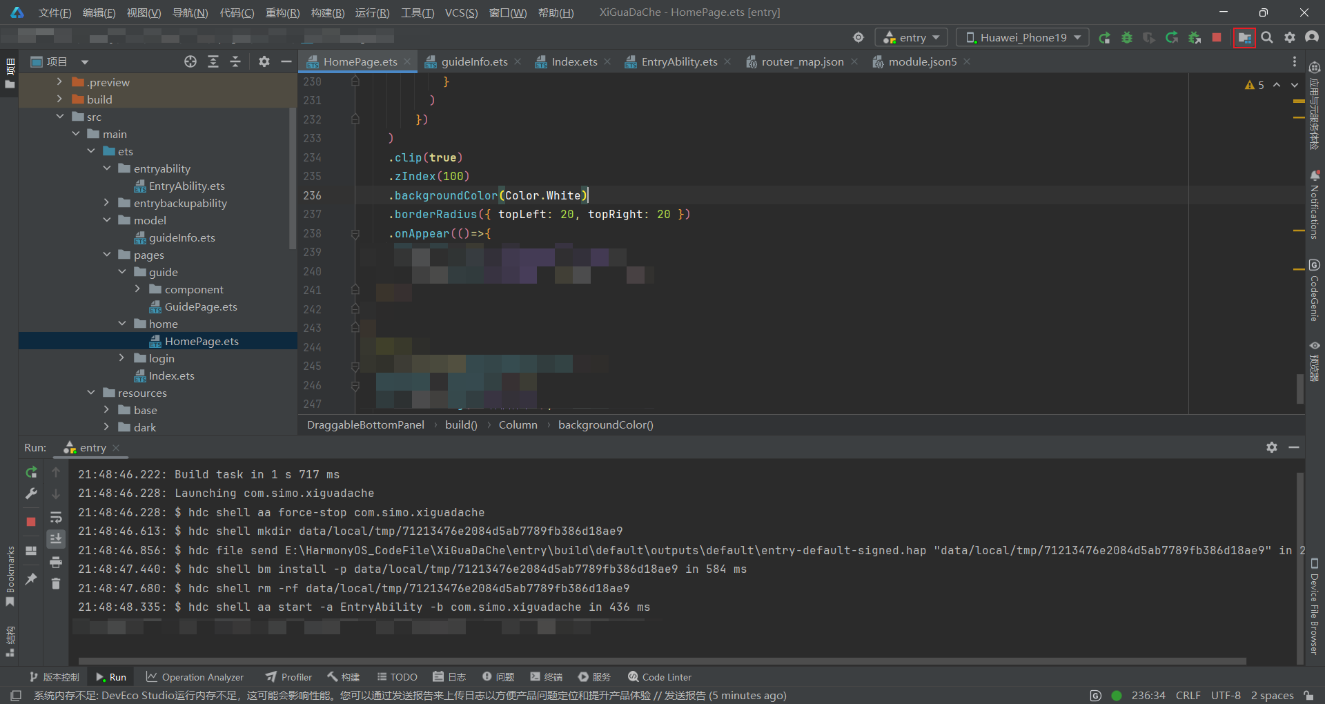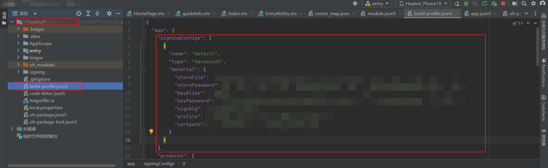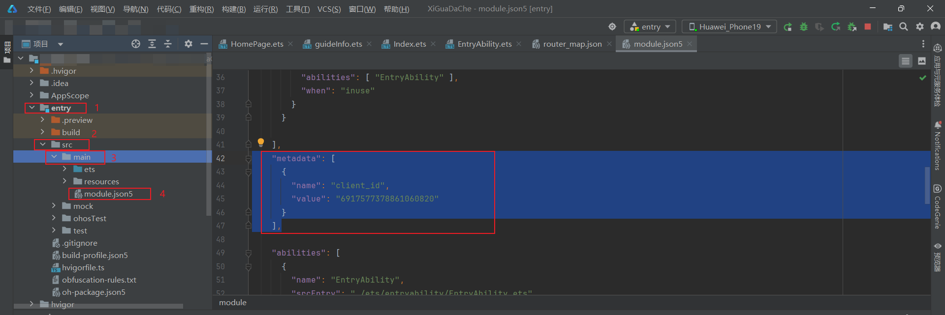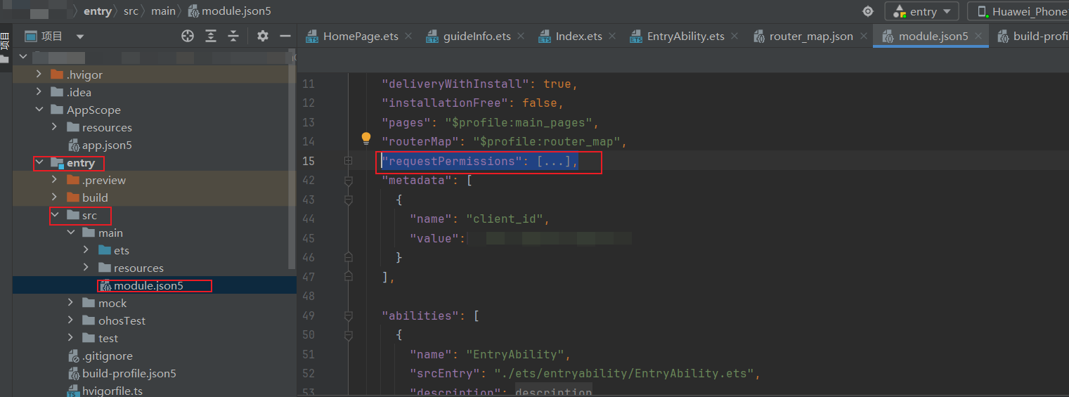 除此之外,还需要在entry->src->main->module.json5中添加如下代码: