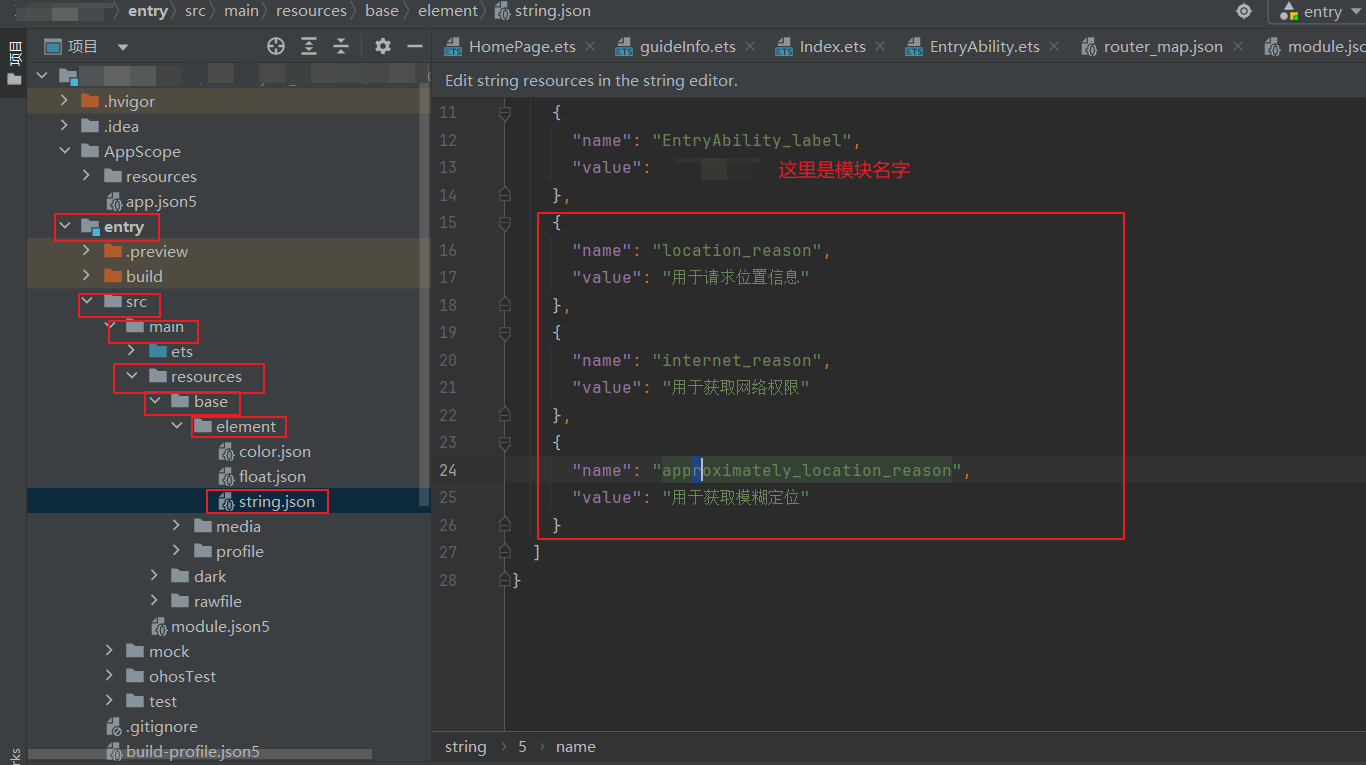 前两个是定位权限(定位相关),后一个是网络权限(地图相关)。由于现在权限申请需要更加规范,故而需要声明多种属性(自测时发现不写reasen等会报错,可能是我的api版本较高的原因)。如果不需要,也可以省略此处除name以外的字段。reason的字段需要在如下位置声明: