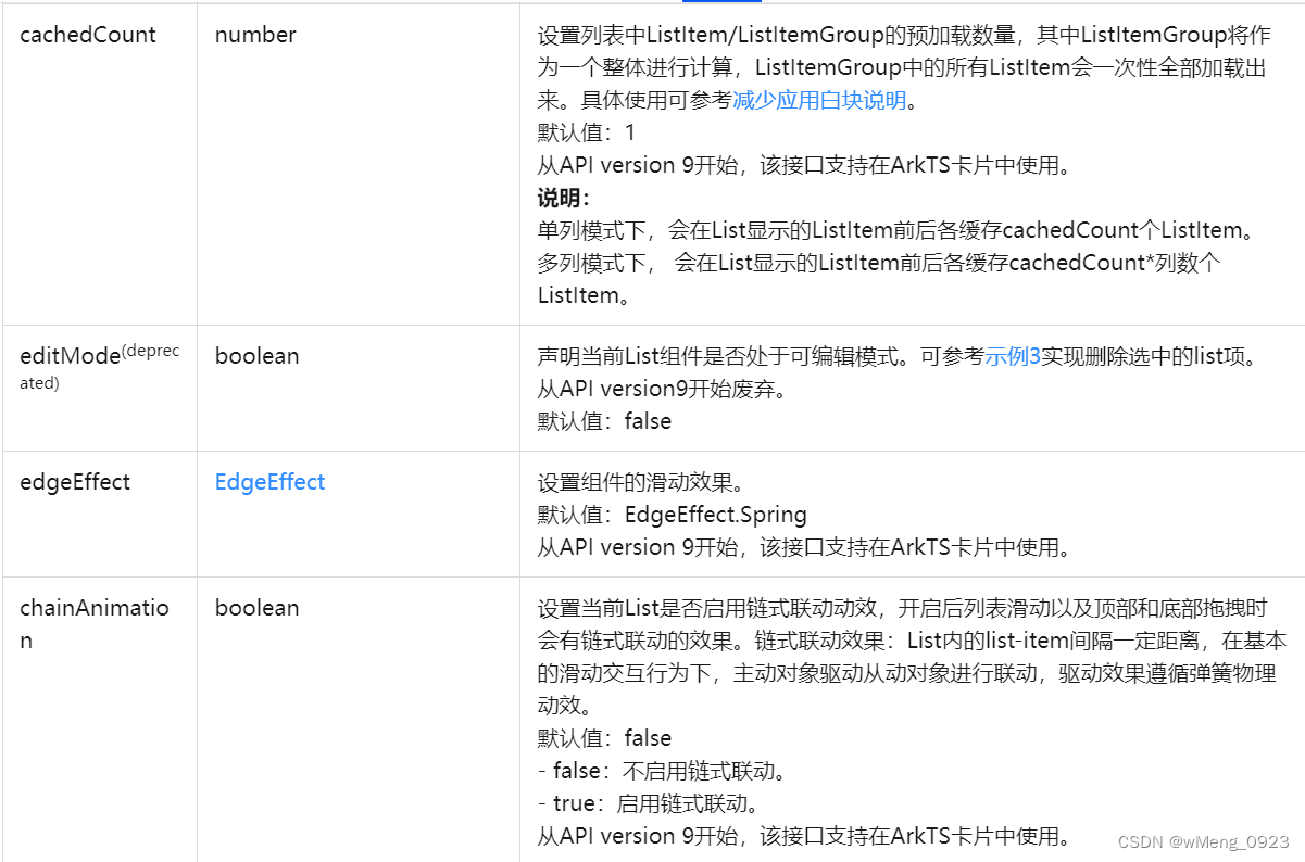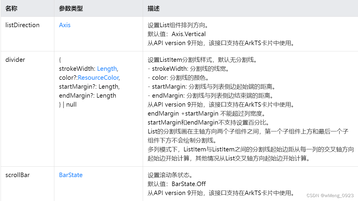 List(value?:{space?:number | string,initialIndex?:number,scroller?:Scroller}),其中参数都为可选,space表示子组件主轴方向的间隔,initialIndex表示设置List初始加载时窗口起始位置显示的子组件索引值,scroll可滚动组件的控制器。注意:在构造滚动组件的控制器时,不可同时绑定两个不同的滚动组件,会导致页面错乱。