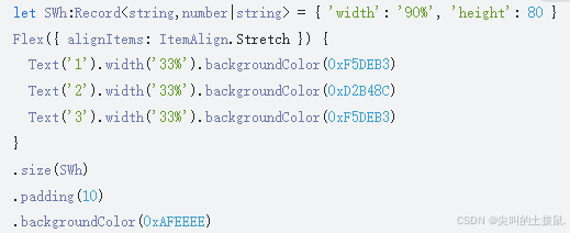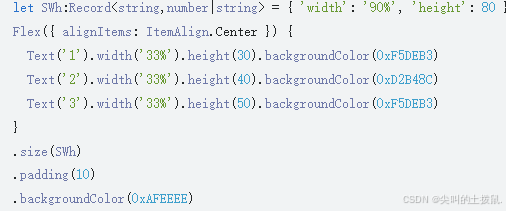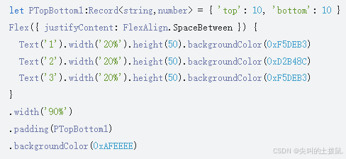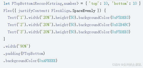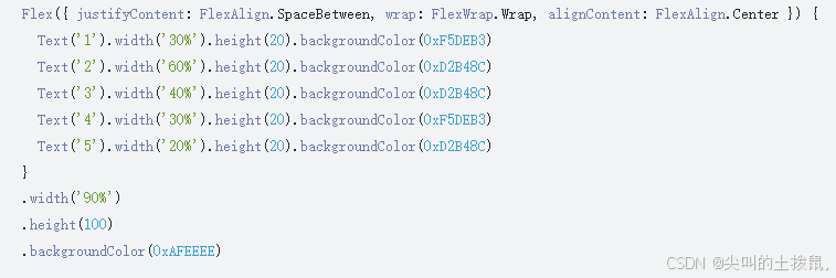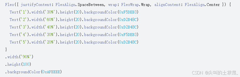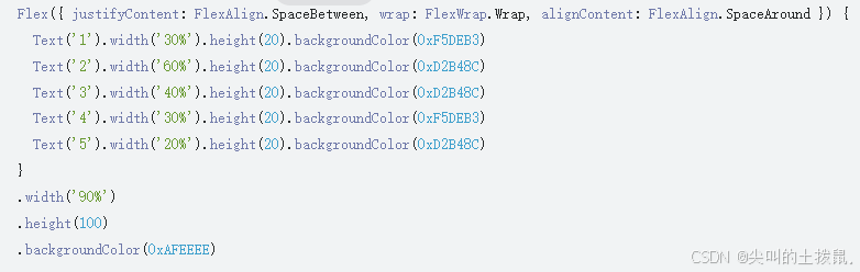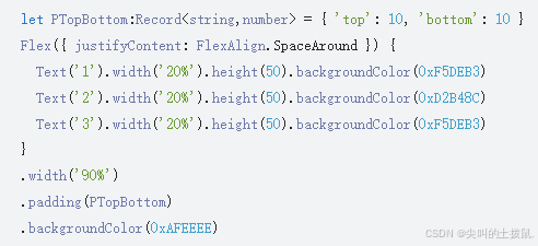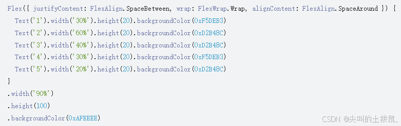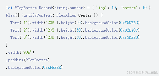 justifyContent(FlexAlign.SpaceAround):水平方向均匀分配元素,相邻元素之间距离相同。第一个元素到行首的距离和最后一个元素到行尾的距离是相邻元素之间距离的一半。