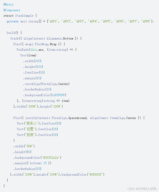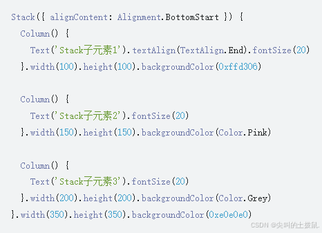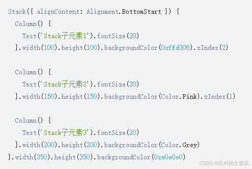 Stack组件为容器组件,容器内可包含各种子元素。其中子元素默认进行居中堆叠。子元素被约束在Stack下,进行自己的样式定义以及排列