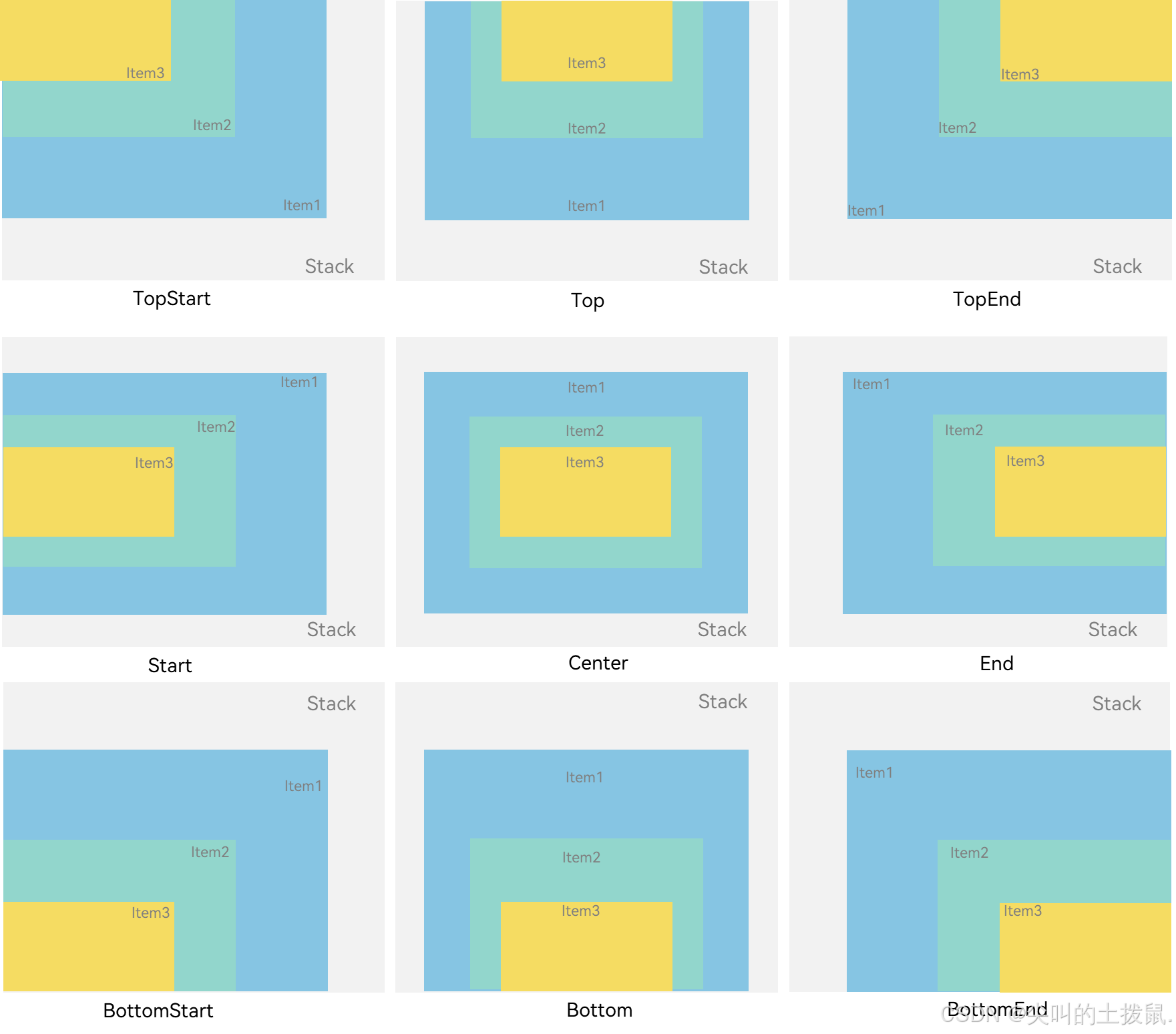 Stack组件通过alignContent参数实现位置的相对移动。如图2所示,支持九种对齐方式。