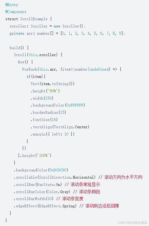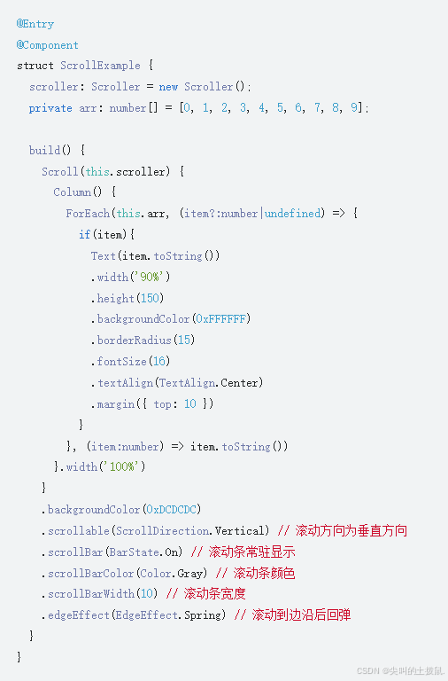 在List中添加滚动条:当List子项过多一屏放不下时,可以将每一项子元素放置在不同的组件中,通过滚动条进行拖动展示。可以通过scrollBar属性设置滚动条的常驻状态,edgeEffect属性设置拖动到内容最末端的回弹效果。