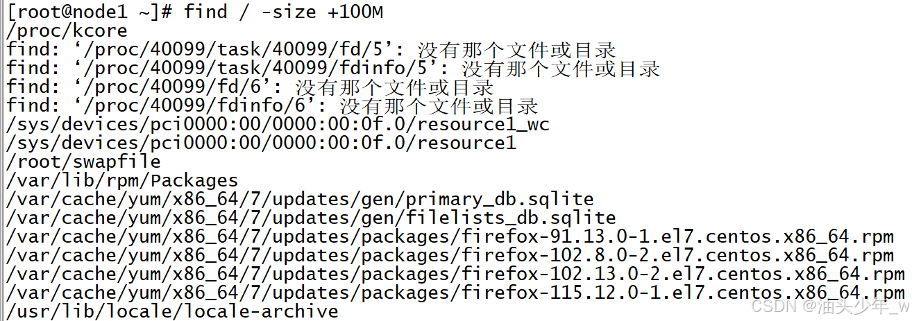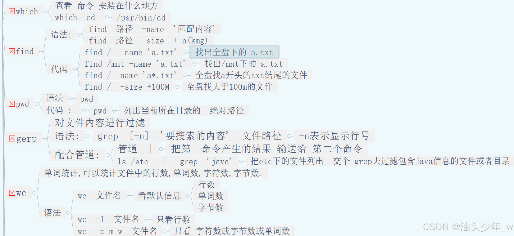 which 要找的命令 > 查找命令所在的位置 find 路径 -name 文件名字 > 根据指定路径查找指定文件 find 路径 -name *文件名字* > 根据指定路径查找模糊匹配文件 * 表示多个任意 find 路径 -size (+-)n(KMG) > 根据文件大小查找 find / -size +10K > 查找根目录下大于10kb的文件 find /root -size -100M > 查找root目录下小于100M的文件