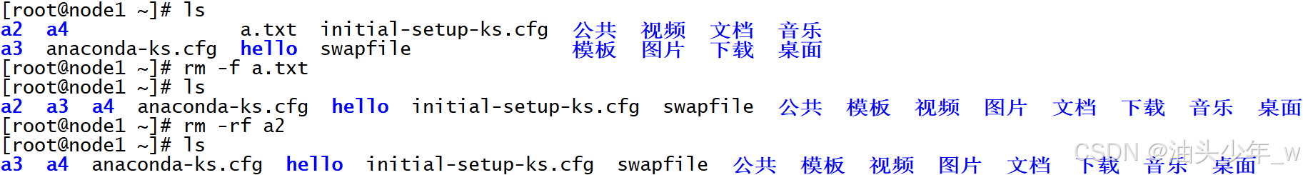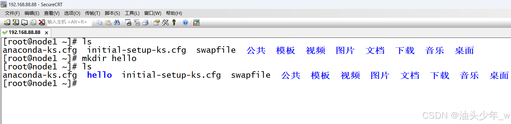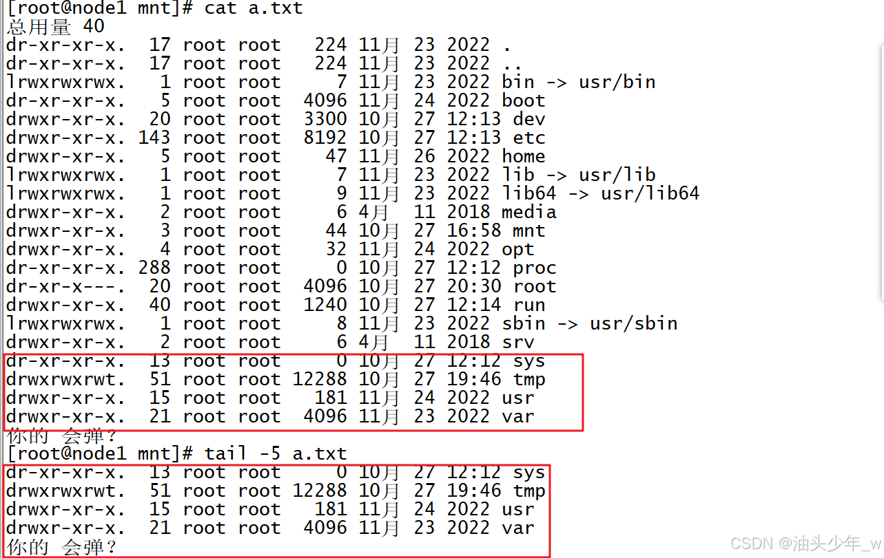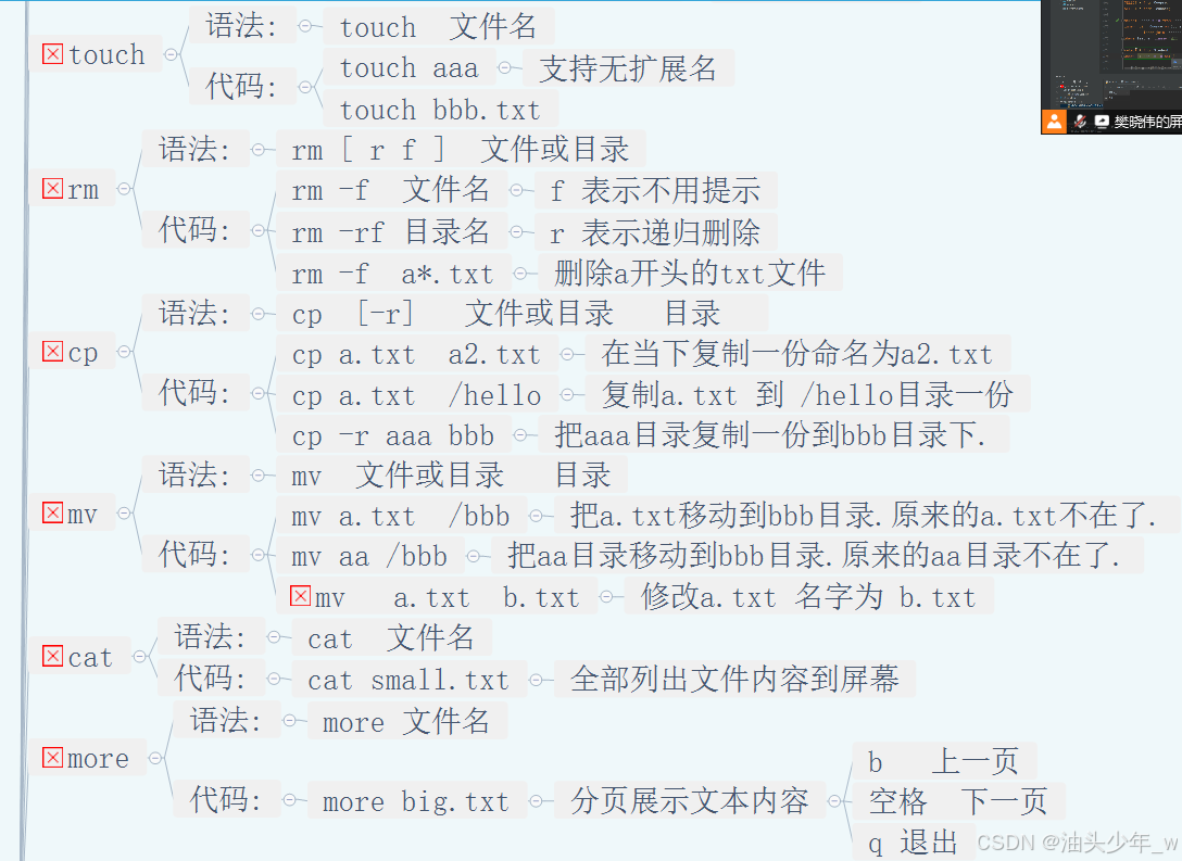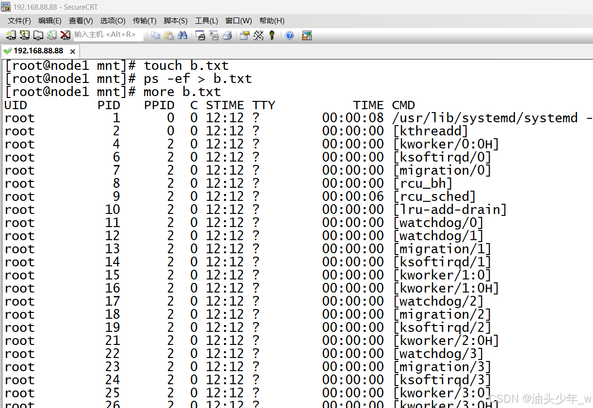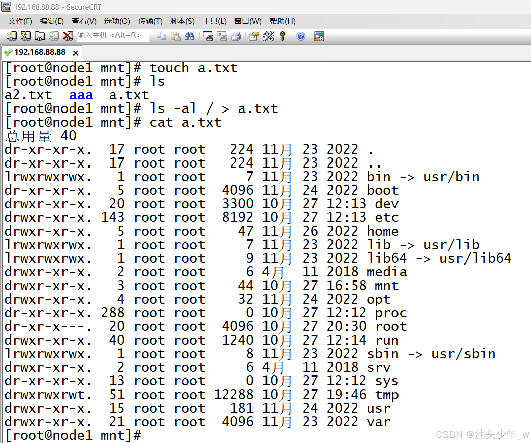 touch a.txt : 创建一个a.txt文本文件 touch b.txt c.txt : 创建b.txt文本文件和c.txt文件 扩展: ls -al / > a.txt 将>前面的命令产生的结果当做文本写入到a.txt文件内. cat a.txt : 查看文件所有内容 more a.txt : 分页查看文件的内容.(按q退出、按空格下一页、按b返回)