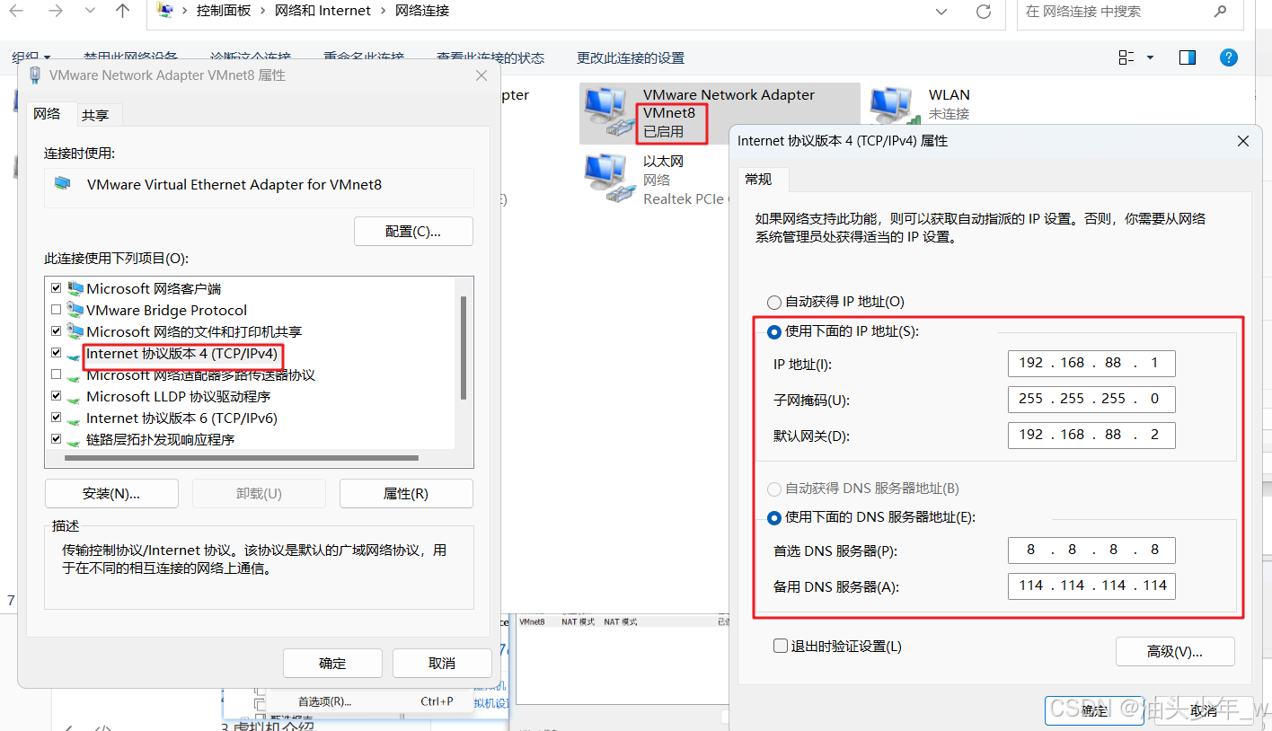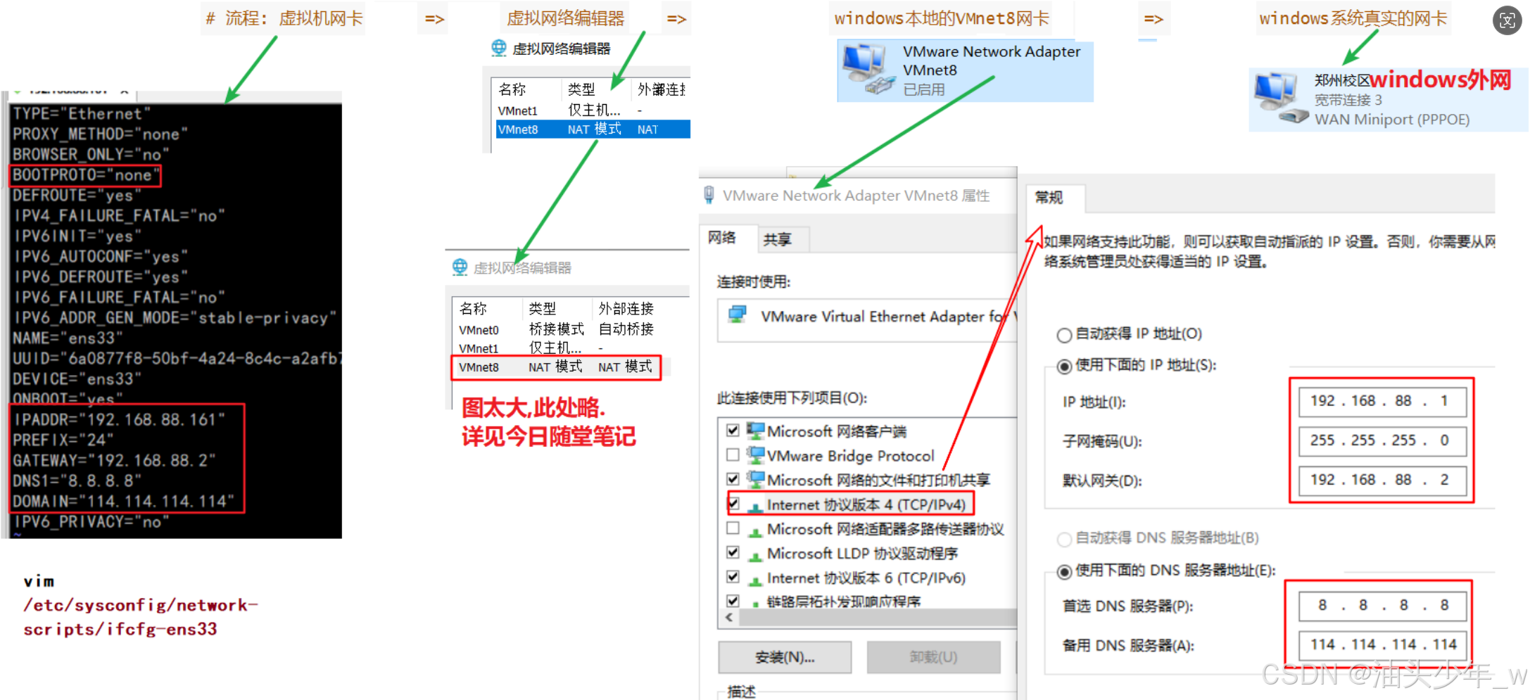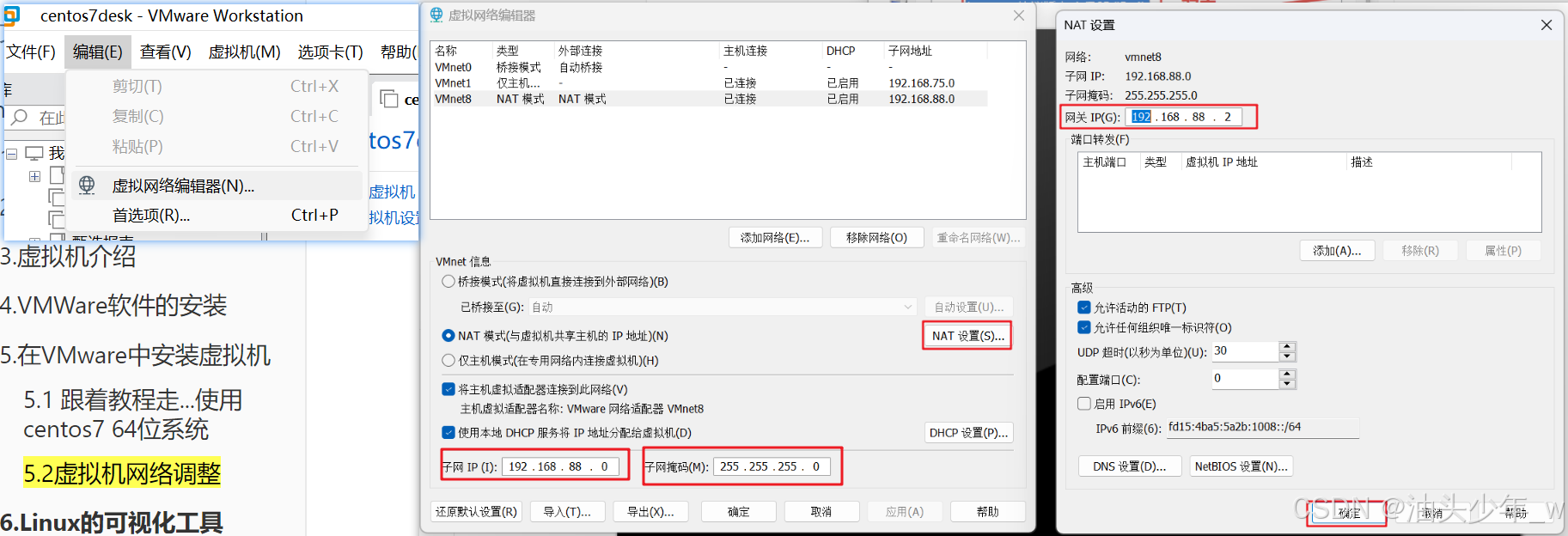 有三处调整网络的地方: 1.配置windows上的vmnet8网卡. 2.配置VM上的vmnet8网卡. 3.centos7系统电脑上的网卡.