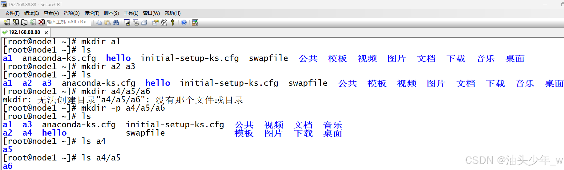 mkdir [-p] 路径 mkdir a : 创建a目录 mkdir a b : 创建a目录和b目录 mkdir -p a/b/c : 创建a目录下有b目录下有c目录 ---------------------------------------- rmdir a : 只能删除空目录 因此以后使用rm来删除有文件的目录.