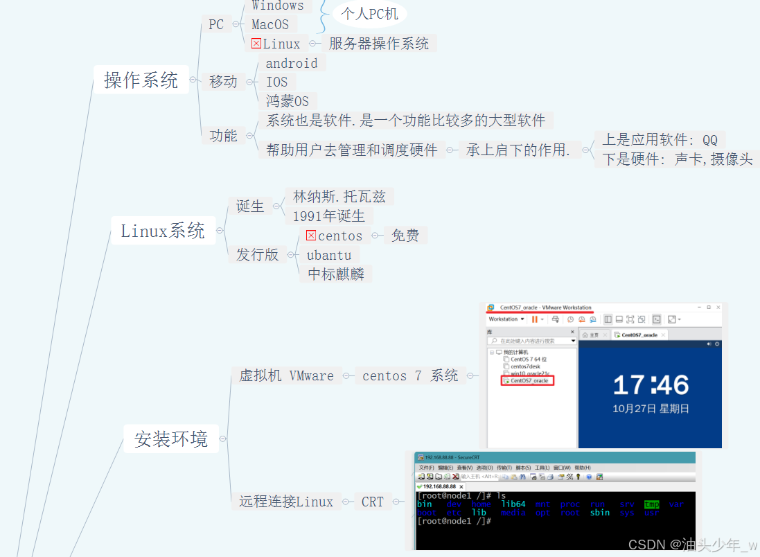 Linux之父: 林纳斯·托瓦兹 吉祥物: 企鹅 Linux内核下载地址: www.kernel.org Linux发行版介绍: 1. Linux发行版指的是: Linux内核 + 系统库 + 系统软件. 2. Linux内核不能直接使用的, 所以不同的公司会在其基础上加入不同的系统库和软件, 就有了不同的发行版 3. 常用的Linux发行版: Ubantu: 比较适合小白, 界面做的不错. RedHat: 小红帽, 属于IBM公司的产品, 收费的. CentOS: RedHat的免费版. 中标麒麟, 红旗等... 4. 本套课程, 我们用: CentOS 7.X