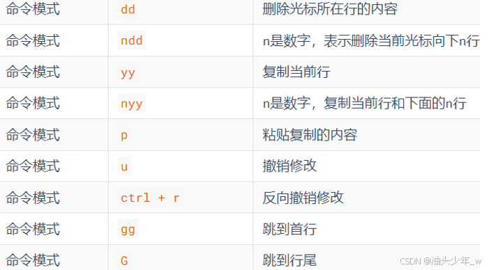 vi 文件名 > 默认进入命令行模式 按 i 键 >进入编辑模式 : 该模式下可以编辑文本 按 esc键 >进入命令模式 : 该模式下可以复制,粘贴,删除多行. 按shift+: >进入末行模式 : 该模式下可以保存退出vi程序.