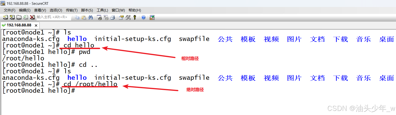相对路径: 相对于当前目录的下一级目录. 绝对路径: 永远都是从根路径发出. /a/b 特殊路径: .表示当前路径 特殊路径: ..表示上一级路径 特殊路径: ~表示家路径 特殊路径: -表示上一次所在的路径