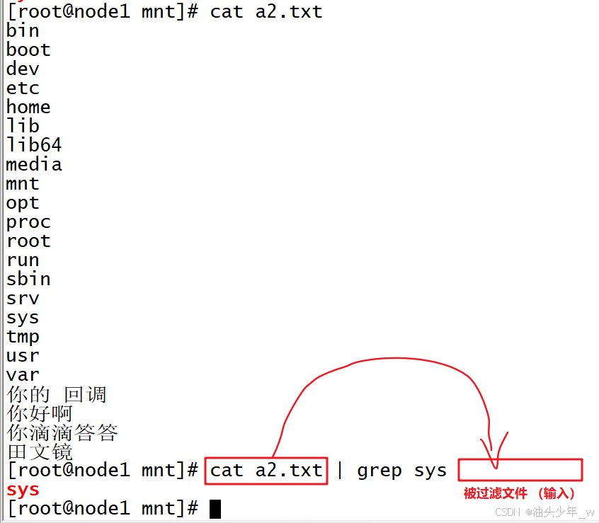 grep "内容" 文件名 grep -n "内容" 文件名 > -n显示行号 wc [c m l w] 文件名 选项,-c,统计bytes数量 选项,-m,统计字符数量 选项,-l,统计行数 选项,-w,统计单词数量 管道符号: | 把前面命令产生的结果 通过管道符号 交给后边的命令去执行.
