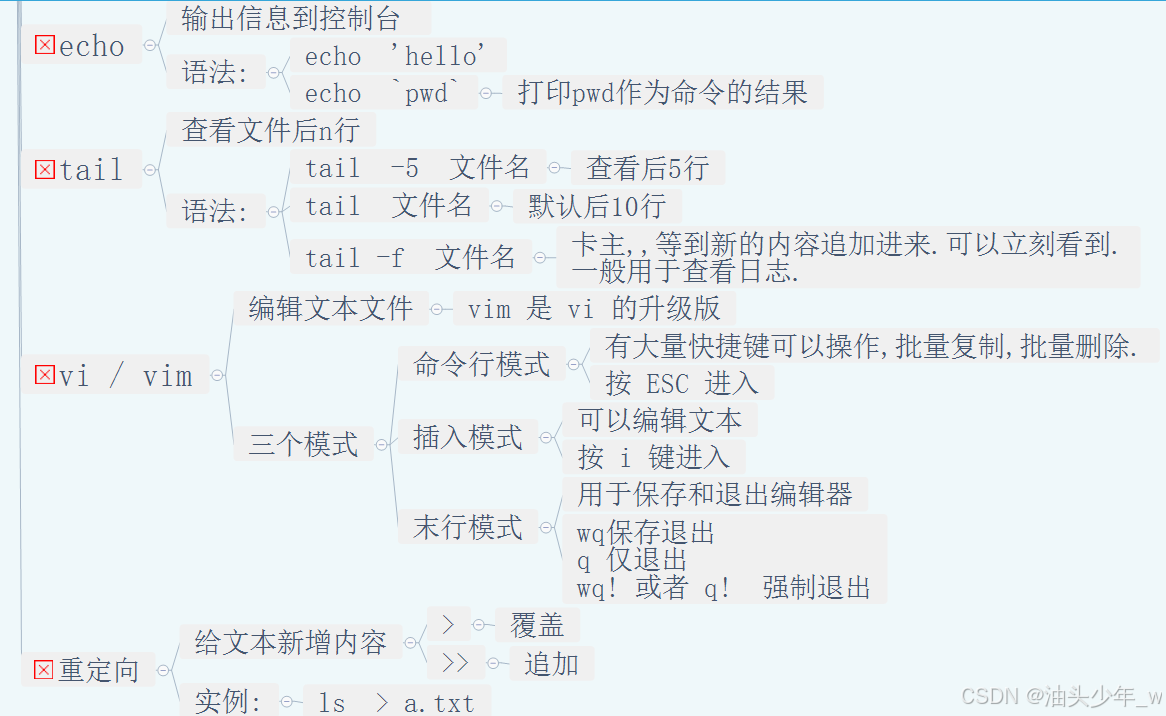echo '打印的内容' -------------------------------------------------- 重定向: > 和 >> > 覆盖原来的数据 >> 在原来基础上又追加新的数据. --------------------------------------------------- tail [f n] 文件 > 查看文件的末尾数据 tail -5 a.txt # 表示查看a.txt末尾的5行数据