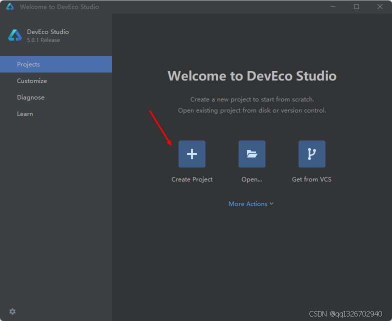 若首次打开DevEco Studio,请点击Create Project创建工程。如果已经打开了一个工程,请在菜单栏选择File > New > Create Project来创建一个新工程。