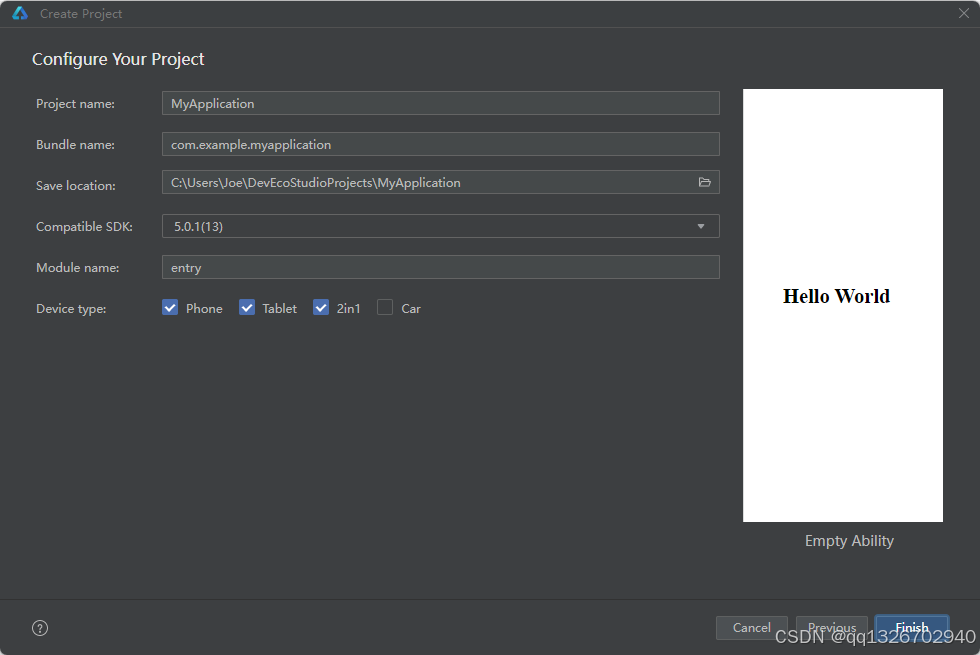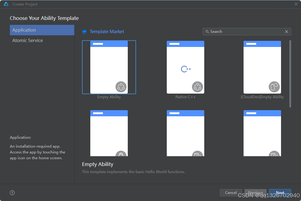 选择Application应用开发(本文以应用开发为例,Atomic Service对应为元服务开发),选择模板“Empty Ability”,点击Next进行下一步配置。