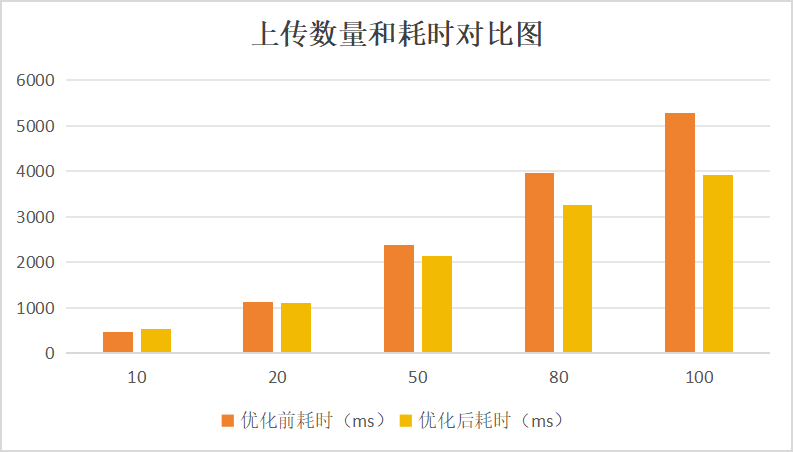由于上传耗时收到网络状态影响偏差较大,结果取的几次测量结果的最小值。但是仍然可以从数据中看出,优化前的耗时基本为线性增长,压缩优化后的耗时在上传文件数量较低时并不明显,还会因为多余的压缩处理影响耗时。不过随着上传的照片数量增多,优化后的耗时和优化之前的耗时差距越来越明显,优化效果越好。