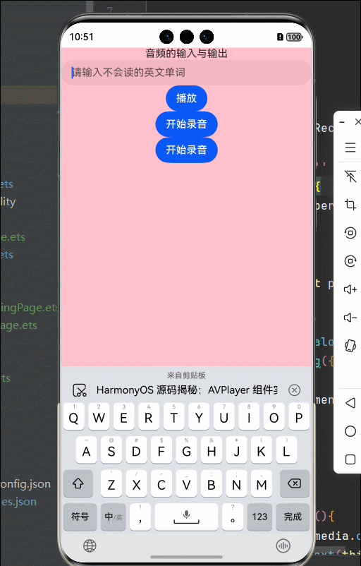 这个 HarmonyOS 应用实现了录音和单词发音两大功能:输入英文单词能弹窗播放发音(调用有道词典接口),还带呼吸灯特效;支持麦克风录音并自动保存为 M4A 文件,可随时启停。核心技术包括动态权限申请、AVRecorder/Player 组件协同、文件描述符直连存储,UI 采用粉色清新风格 + 自定义弹窗。适合学习英语或做语音备忘录,代码结构清晰,适合学习 HarmonyOS 音视频开发。