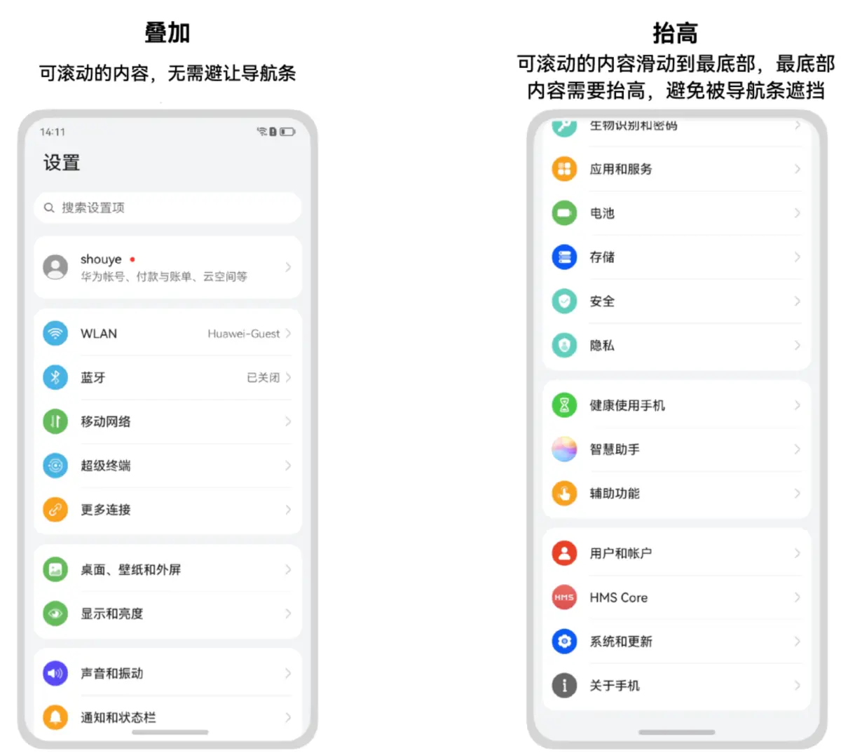 图2 界面元素自动避让状态栏和导航条示意图