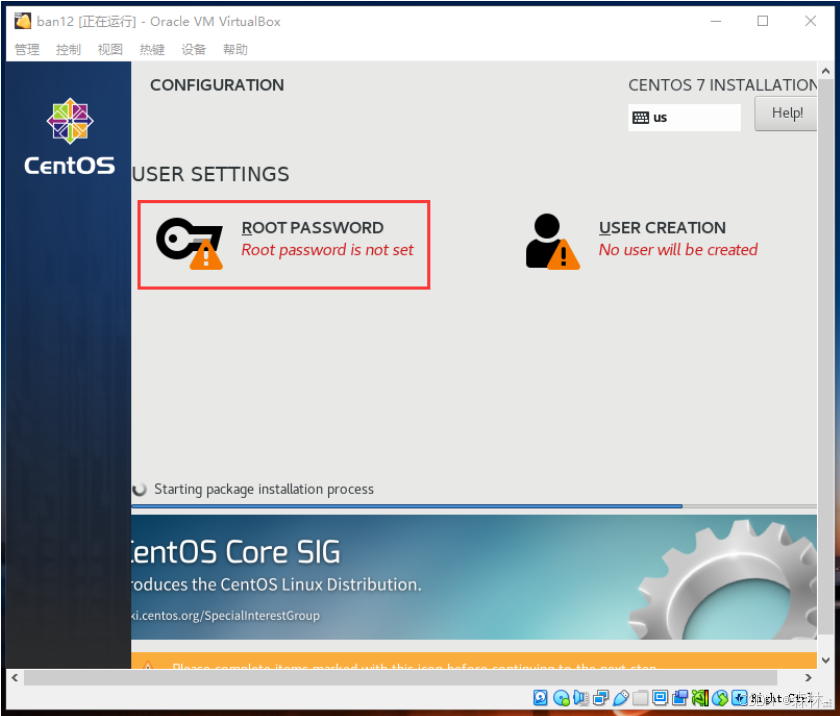 进入 “INSTALLATION SUMMARY” 界面,需完成以下关键配置(带黄色警告的必须处理):