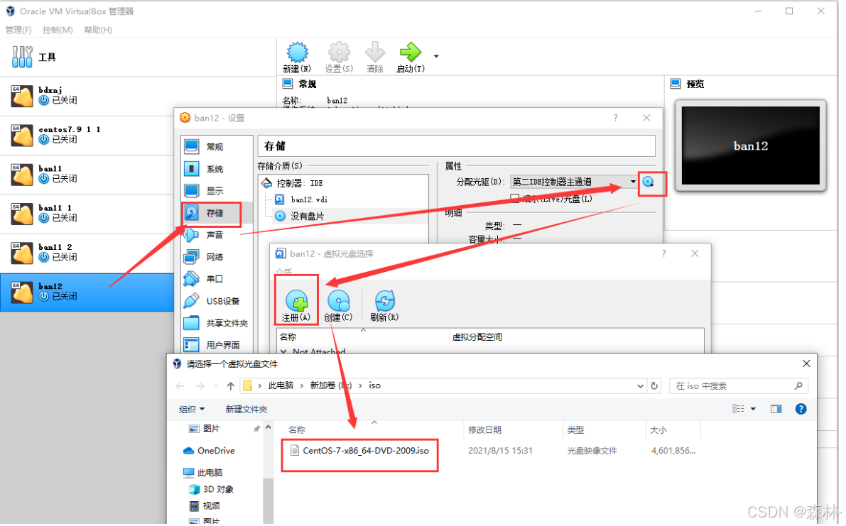 - 选中新建的虚拟机(比如 “CentOS 7.9”),点击 “设置”→“存储”;