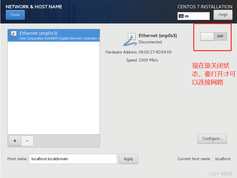 - 主机名:自定义(比如 “centos7”),点击 “Apply”;