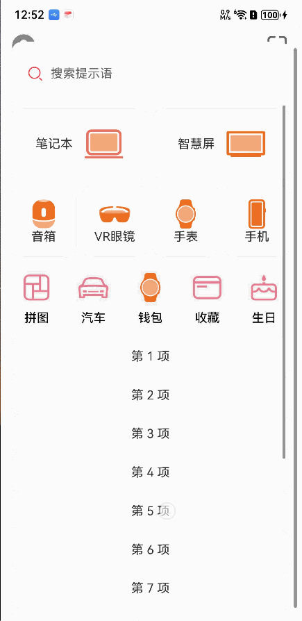 这里我们做的简单点,分类项的缩放值和不透明度取相同值,就不再额外计算了。如果需要修改效果,根据滑动偏移量重新计算一个值就好了。
