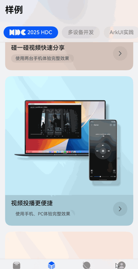 - 样例页:覆盖 UI、AI、适配、多设备交互、安全、质量优化等,关键是很多场景能立即运行;