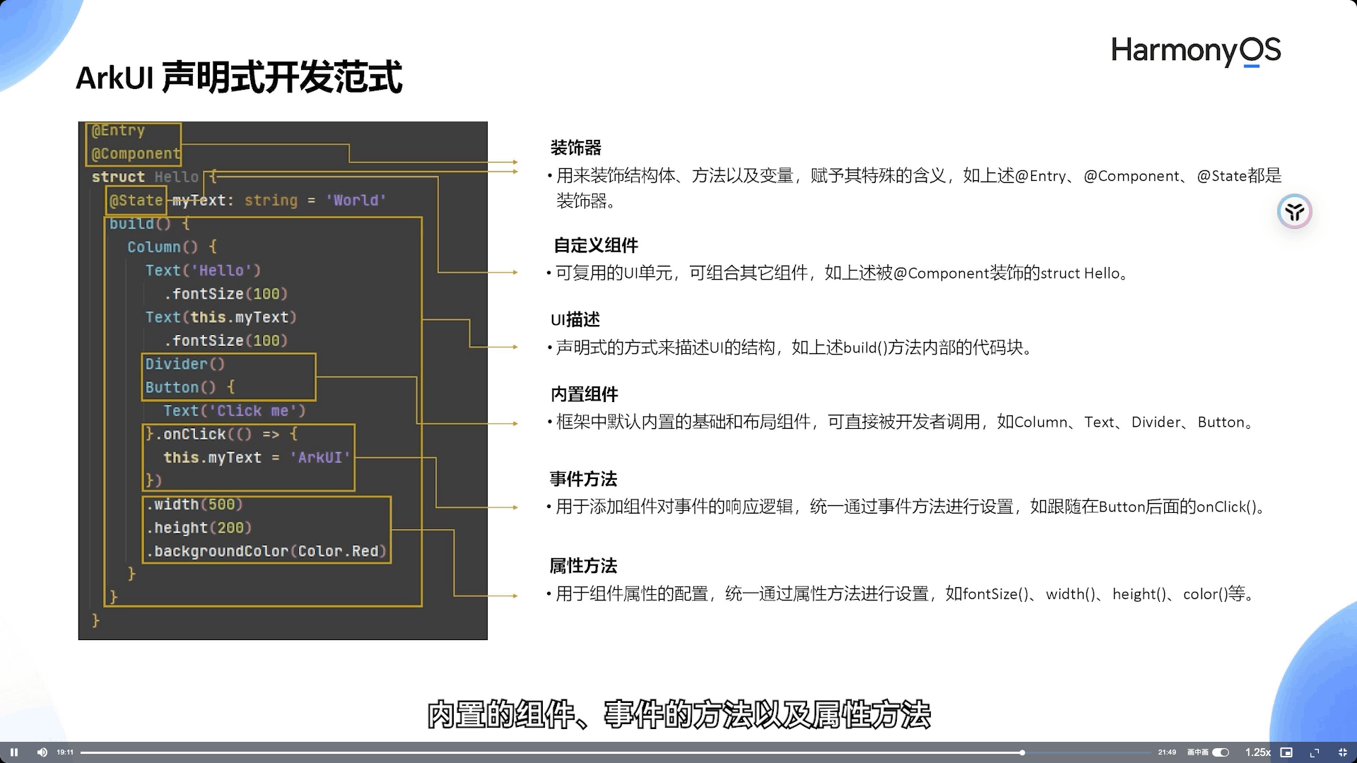 这是一个以ArkUI声明式开发的一个范式,通过装饰器、自定义组件、UI描述、内置组件、事件方法、属性方法可以方便的开发一个控件,通过控件组合成一个页面,来满足我们的业务需求。