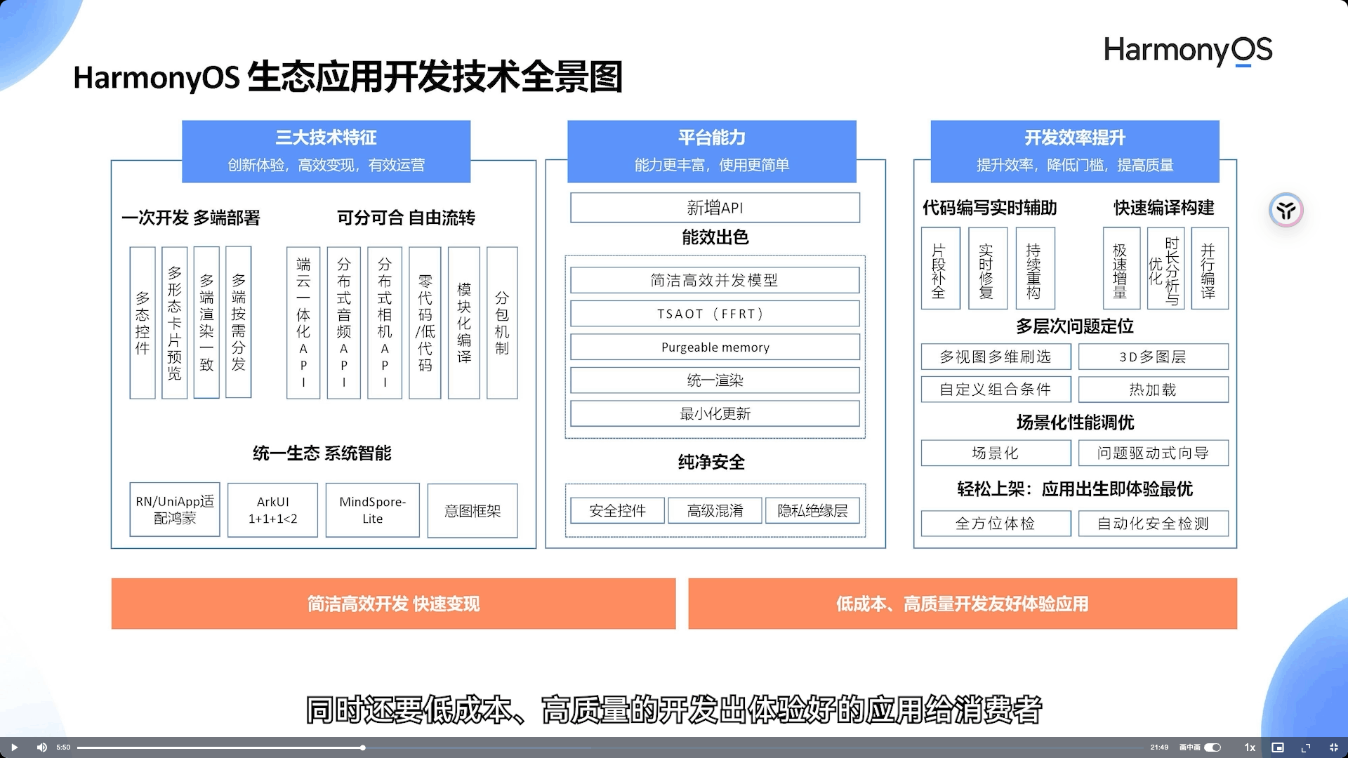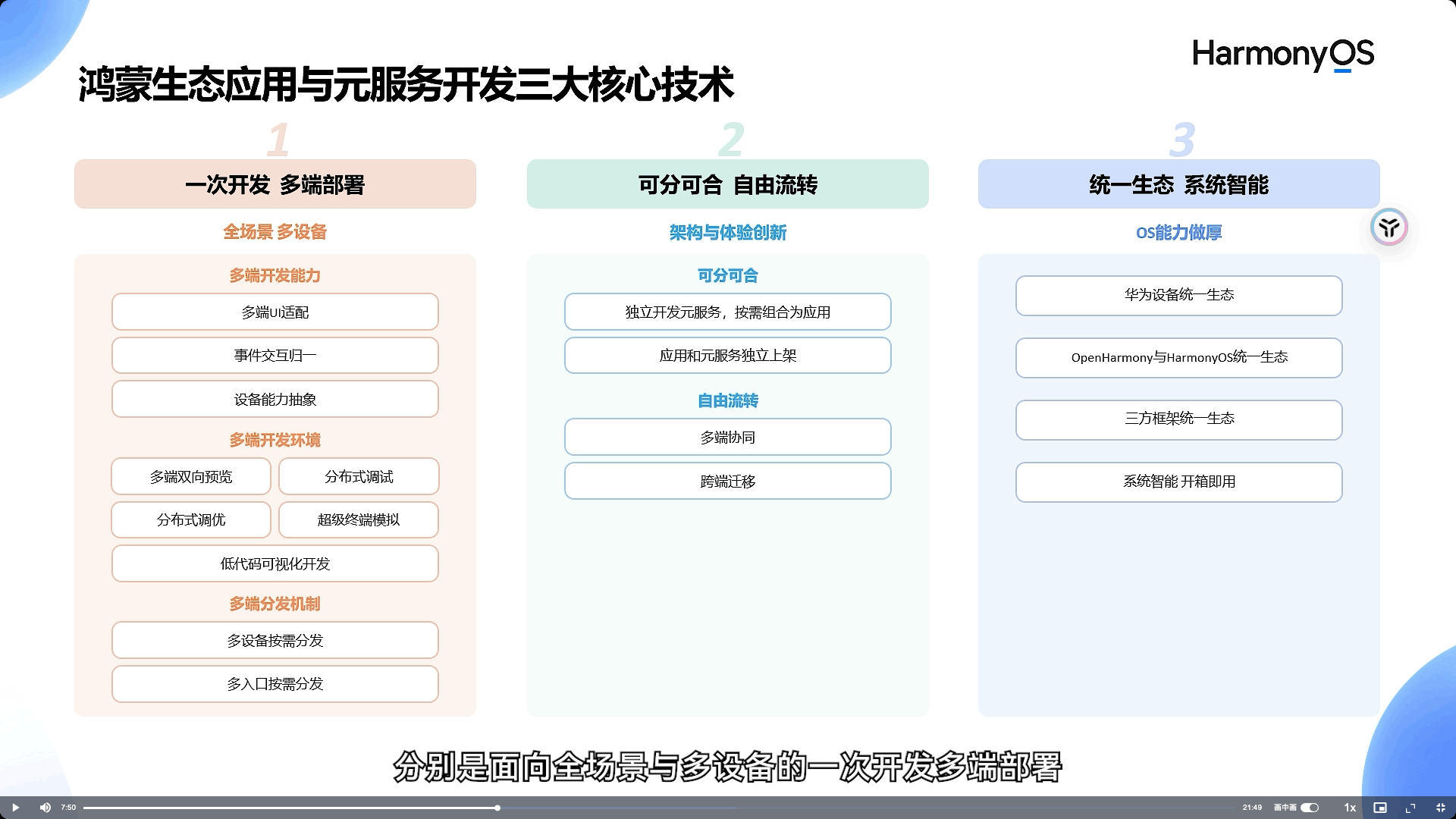 课程介绍了鸿蒙生态应用与元服务开发的三大核心技术,分别是“一次开发,多端部署”、“可分可合,自由流转”以及“统一生态,系统智能”。