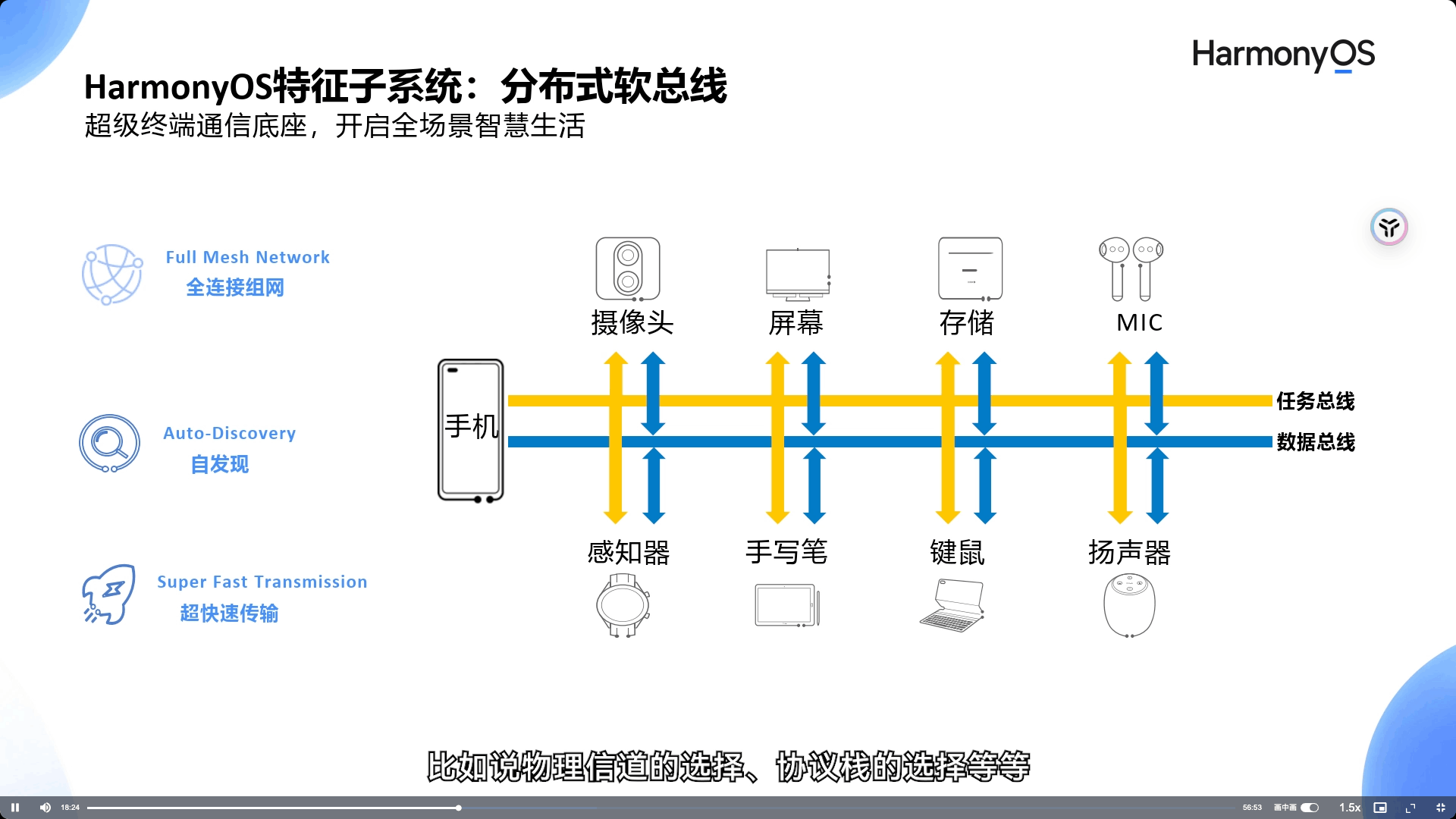 - 分布式软总线是HarmonyOS超级终端的通信基座,为设备之间的互联互通提供了统一的分布式通信能力。它支持多模通信协议的动态选择与无缝切换,实现微秒级延迟抖动控制,确保设备间通信的高效和稳定。
