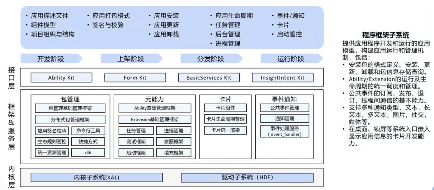 - 用户程序框架子系统:管理应用生命周期、安装、启动、资源分配及安全校验。